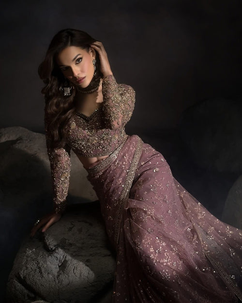 Mauve Rose Sequin-Embellished Net Saree with Heavily Embroidered Full-Sleeve Blouse